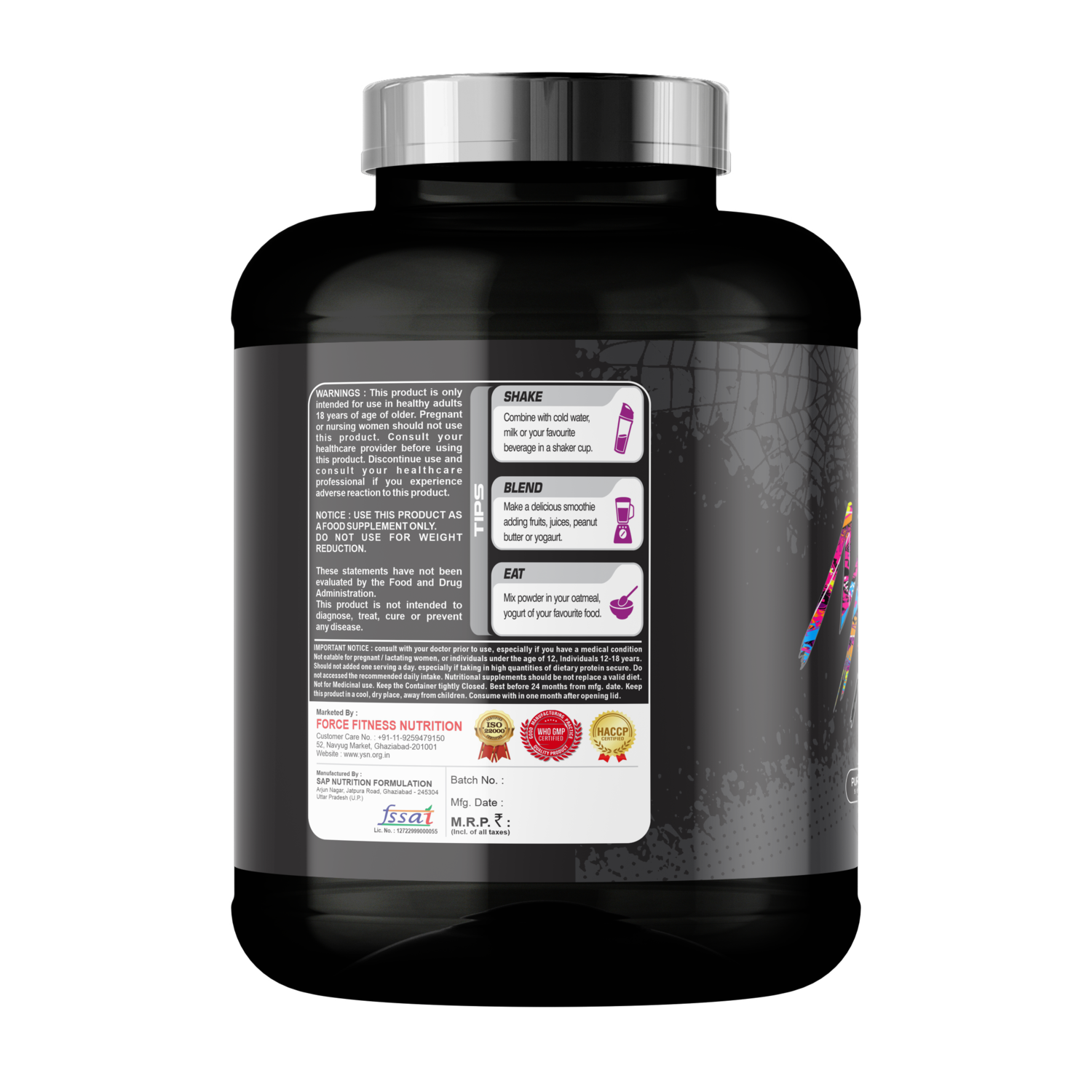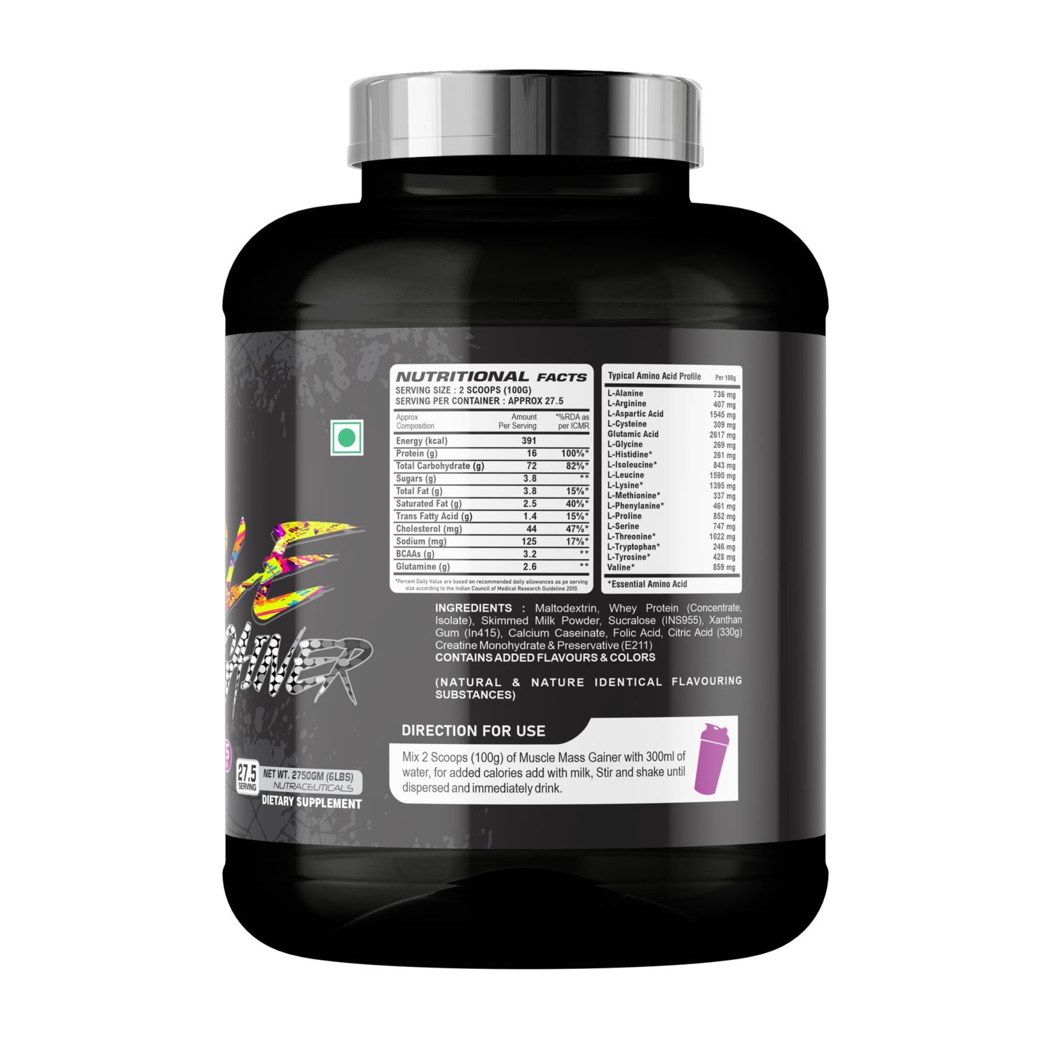 • Simply mix one scoop (150g) of Muscle Mass Gainer with 250-300 ml of water or milk in a shaker or blender. You can also toss in a handful of ice cubes for an extra chill. For optimal results, We recommend 1 serving per day post workout.
